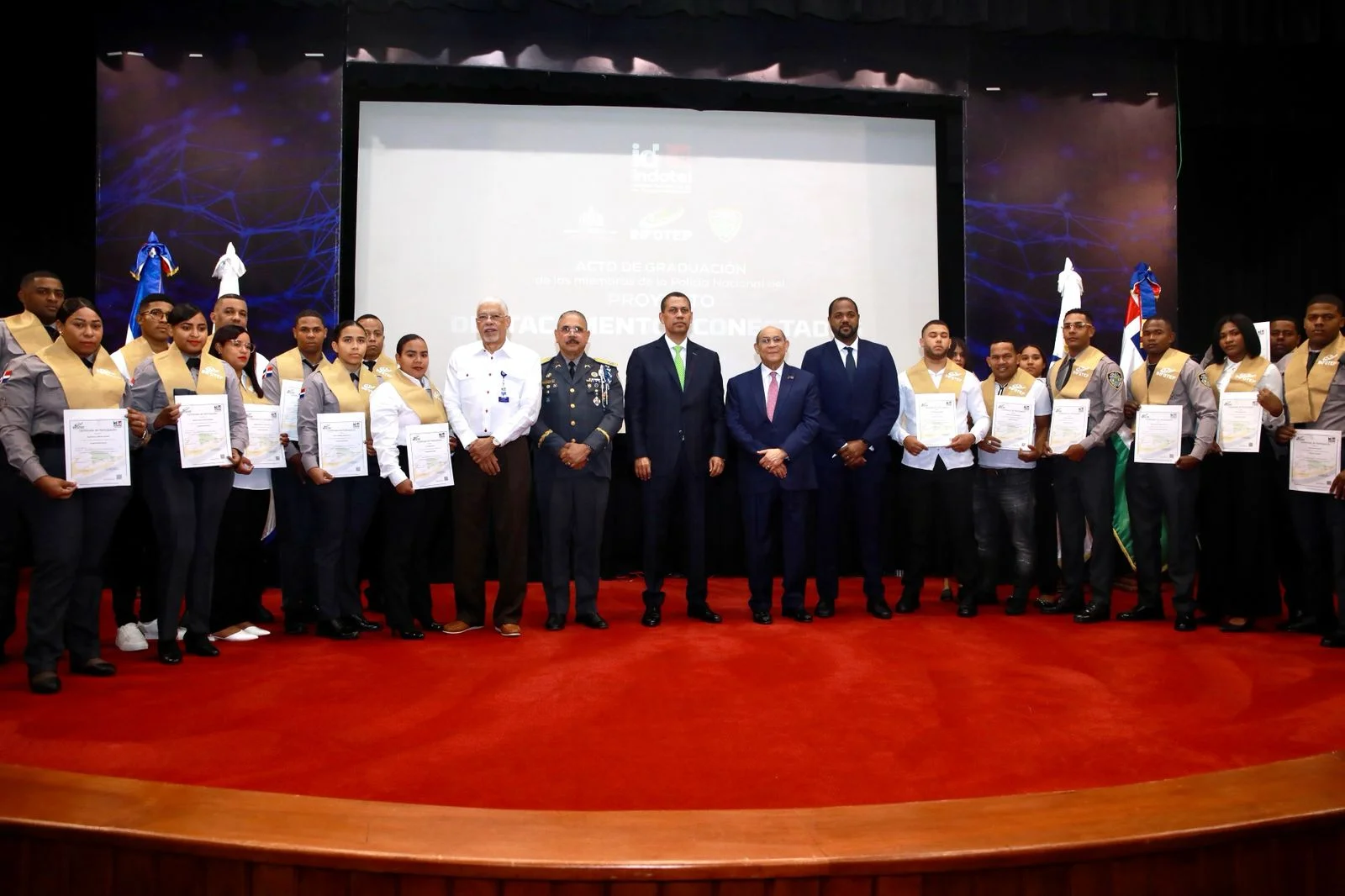 Santo Domingo.- Como parte del proyecto «Destacamentos Conectados», el Instituto Dominicano de las Telecomunicaciones (INDOTEL), en colaboración con el Instituto Nacional de Formación Técnico Profesional (INFOTEP) y el Ministerio de Interior y Policía (MIP), encabezó la primera fase de la graduación de 147 agentes de la Policía Nacional. Estos agentes fueron capacitados en el manejo de herramientas tecnológicas para ofrecer un servicio más eficiente en los destacamentos del país.